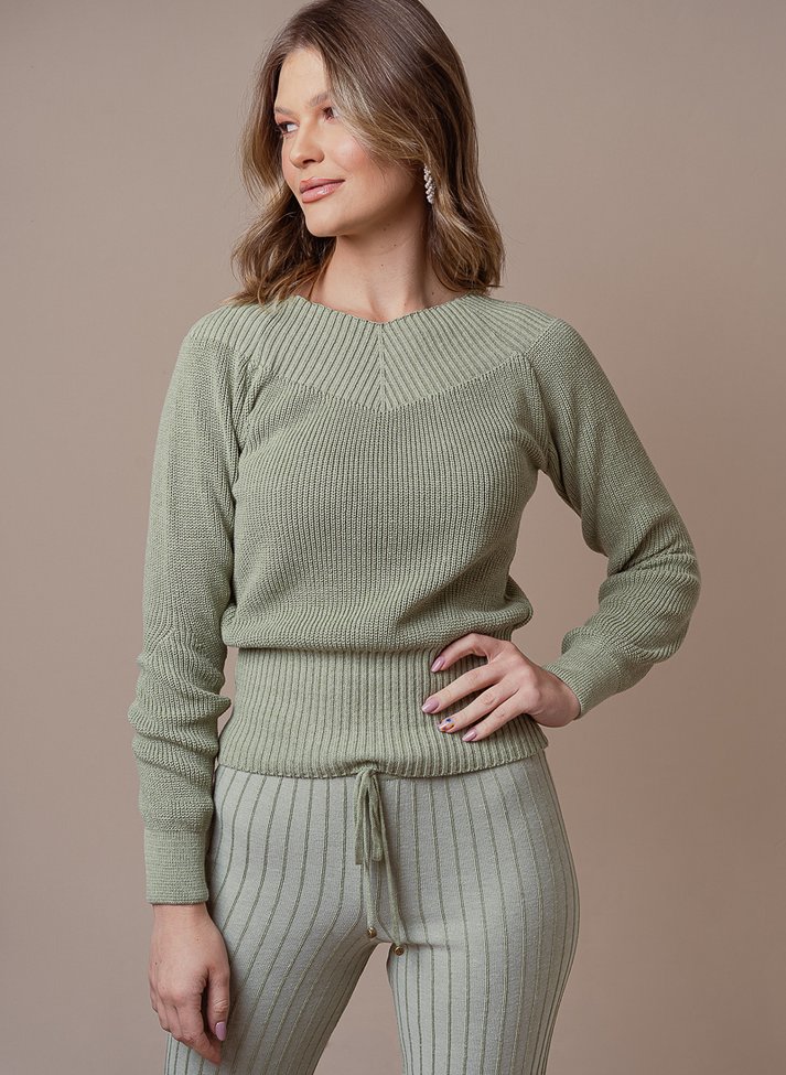 A BLUSA 20177 de modelagem ajustada valoriza a silhueta. A peça possui cintura marcada por uma barra canelada, decote “V” e manga raglan. De manga longa e confeccionada com fio de algodão, ela é leve e perfeita para os dias amenos.