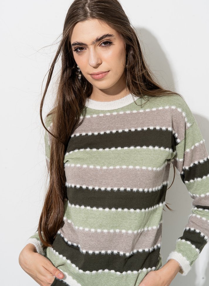 A blusa ref 20271 possui trama lisa com listras largas horizontais em fio de algodão e, entre elas, pontilhado em fio peludinho. O mix de cores e fios formam uma combinação harmônica que abre um leque de possibilidades para compor seu look, fazendo com que a peça se adeque à vários estilos. Confeccionada com fio de algodão misturado ao peludinho, a peça possui toque agradável em contato com a pele, sendo uma gostosura de vestir.