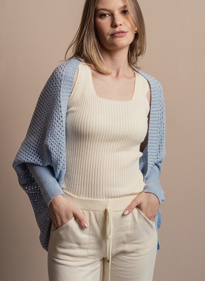 A Capa Casulo Ref 401 possui ponto vazado trazendo leveza para a peça. Com modelagem morcego e levemente alongada, a peça possui punhos canelados que se ajustam. A capa casulo é uma peça despojada e super diferente.