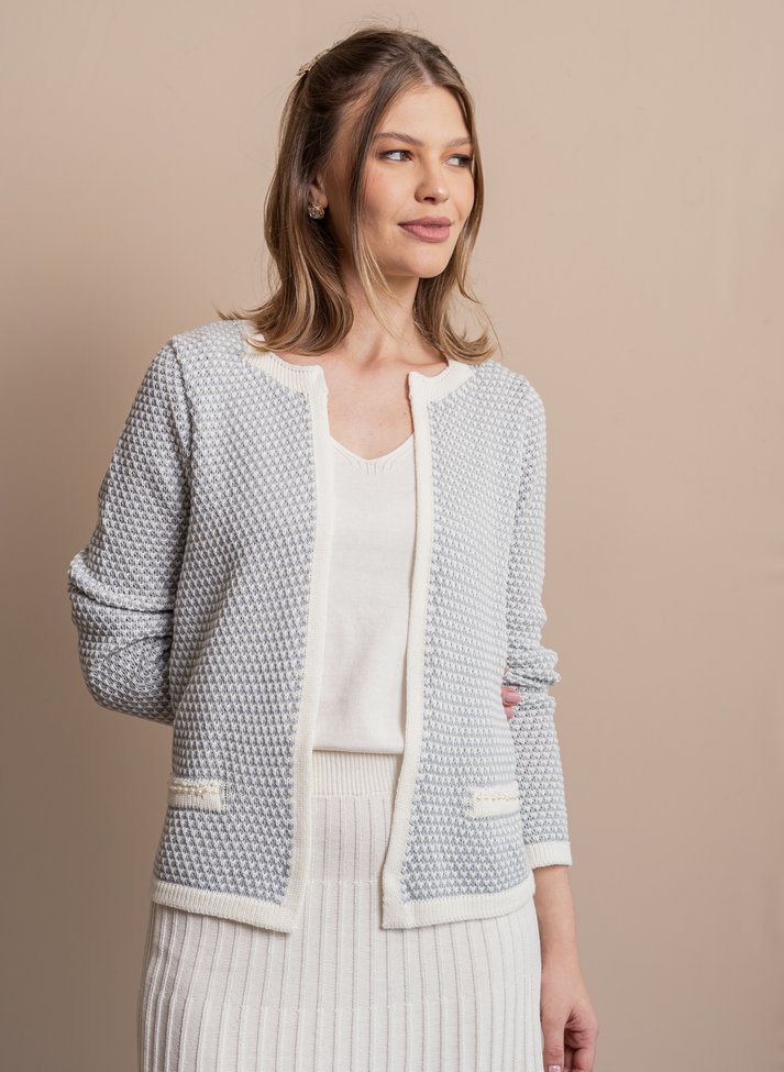 O casaco Chanel ref 328 possui um ponto que lembra um tweed. Perfeito para dar um up no look, o casaco Chanel transforma suas produções adicionando textura e um toque clássico. Rico em detalhes, ele possui bolsos frontais fakes com pérolas bordadas à mão. Com gancho para fechamento, ele pode ser usado aberto ou fechado.