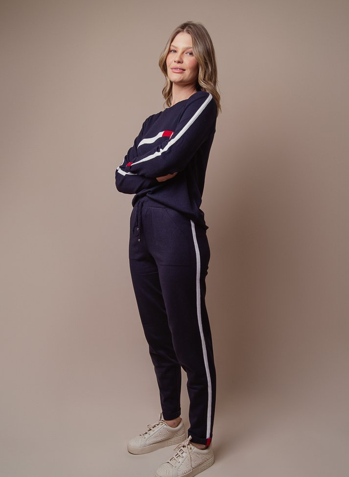 O Conjunto Esporte é composto por calça e blusa manga longa que conversam entre si. Sua calça possui modelagem jogging com listra na lateral e um lindo detalhe na barra, este mesmo detalhe é encontrado no punho da blusa que o acompanha. A blusa possui listra na manga que dá continuidade na calça. Além de todos estes acabamentos, a blusa possui listra horizontal na altura do busto