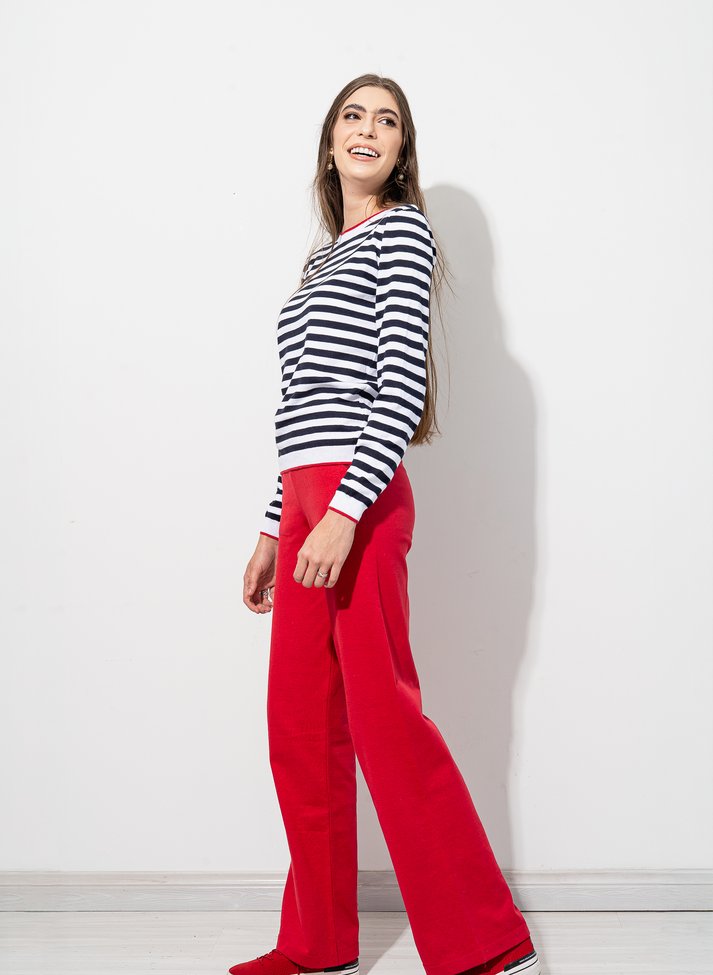 O Conjunto Navy composto por calça wide leg pantalona lisa vermelha e blusa listrada manga longa é aquele tipo de look que você não vai querer tirar do corpo.
