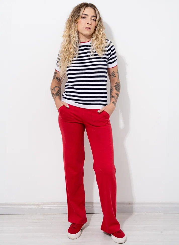 O Conjunto Navy composto por calça wide leg pantalona lisa vermelha e blusa listrada manga curta é aquele tipo de look que você não vai querer tirar do corpo. · CALÇA WIDE LEG PANTALONA: Feita com fio de algodão vermelho, a peça oferece conforto sem igual e total liberdade para os seus movimentos. Nossa calça wide leg pantalona possui bolsos frontais, cordão para amarração e perna larga. Ela é ideal para compor looks confortáveis e elegantes.(Wide leg (perna larga); Cintura elástica; Cordão para amarração; Bolsos frontais).•BLUSA LISTRADA MANGA CURTA: Uma obra-prima de elegância e estilo atemporal, a blusa listrada de modelagem tradicional, possui corte reto, cava posta e decote redondo. No estilo navy, as listras intercalam branco e marinho, e para trazer um toque de modernidade, na borda da manga, do decote e da barra, ela traz o vermelho que se sobressai das demais. Esse design, mostra como a Michele Tricot se preocupa até mesmo com os pequenos detalhes. (Modelagem Reta; Cava Posta; Manga Curta; Gola Redonda; Listrada; Confeccionada com Fio de Algodão).