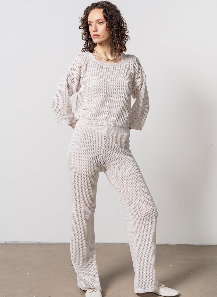 · CALÇA BOHO VAZADA: Com ponto aberto e com textura ela traz o visual do crochê feito à mão. Sua modelagem reta alonga a silhueta, enquanto seu ponto traz leveza e fluidez. Como uma das maiores preocupações da Michele Tricot é trazer, além de beleza, conforto para quem a veste, a Calça Boho possui cintura elástica e forro em tricô com elastano que é como se fosse uma bermudinha.