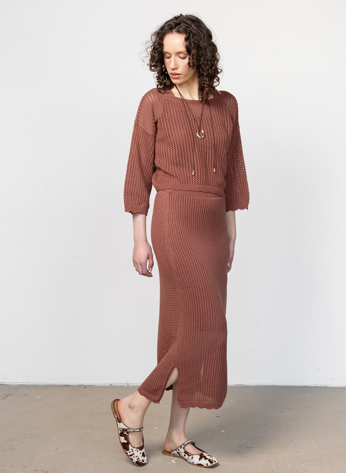 · SAIA VAZADA MIDI: De modelagem reta e comprimento midi, a peça possui ponto aberto e com textura trazendo todo visual do crochê feito à mão. Com cintura elástica, fendas nas duas laterais e forro com elastano, ela traz conforto e total liberdade para seus movimentos.